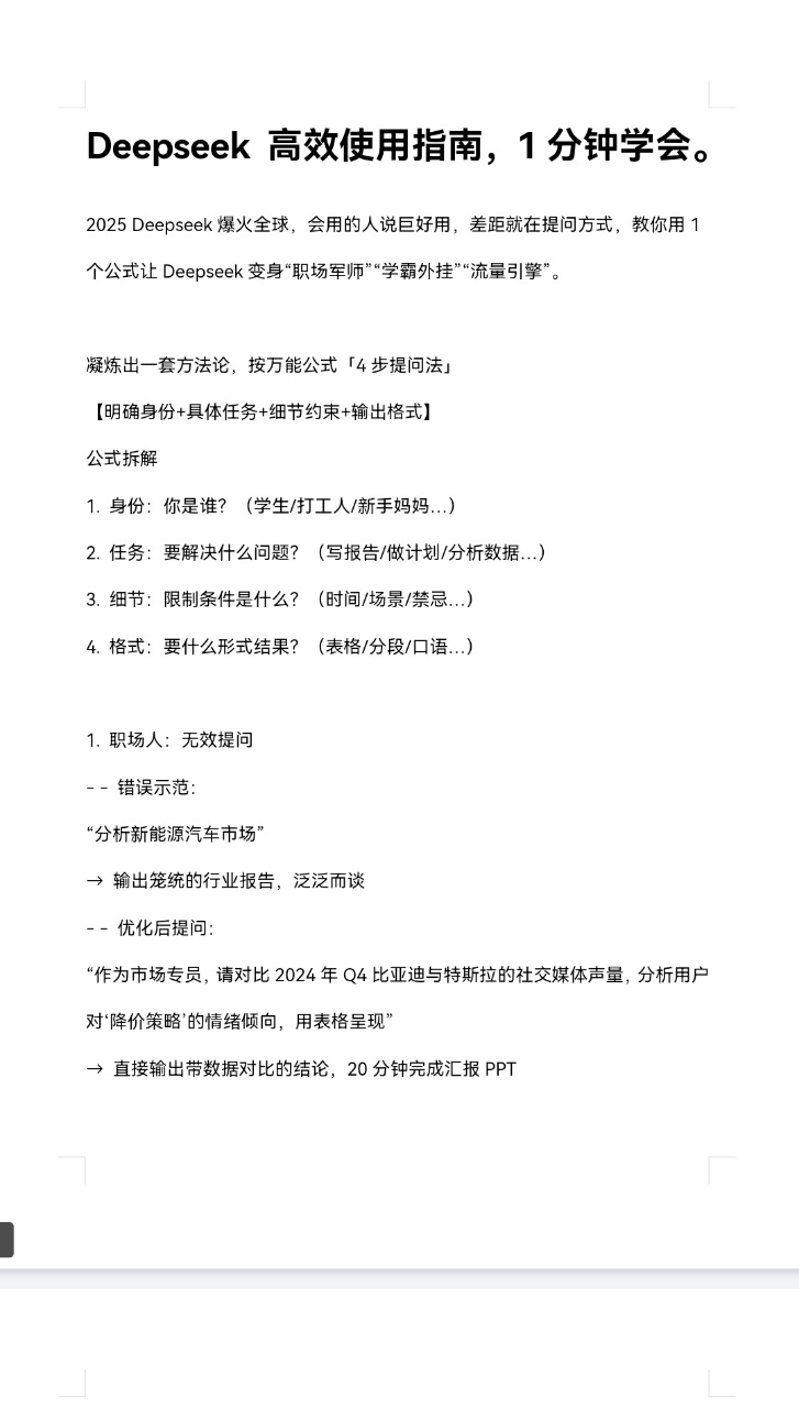 deepseek真的太好用了,用来辅助写文章,写脚本,写文案,真的效率提升了很多,如果你不知道如何给deepseek投喂指令的话,下面这些资料,是可以帮到你的!